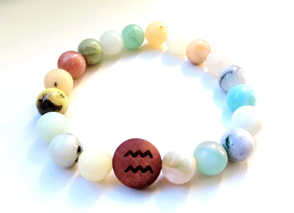 Velké korálky z přírodního minerálního kamene s dřevěným gravírovaným korálkem - znamení zvěrokruhu.