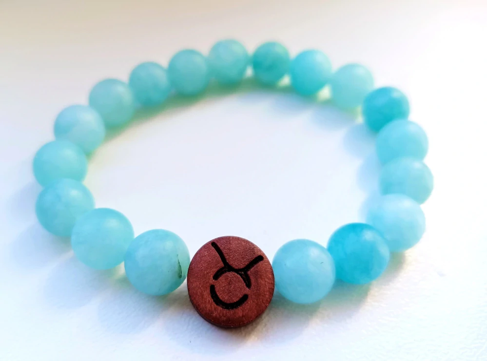Velké korálky z přírodního minerálního kamene s dřevěným gravírovaným korálkem - znamení zvěrokruhu.
