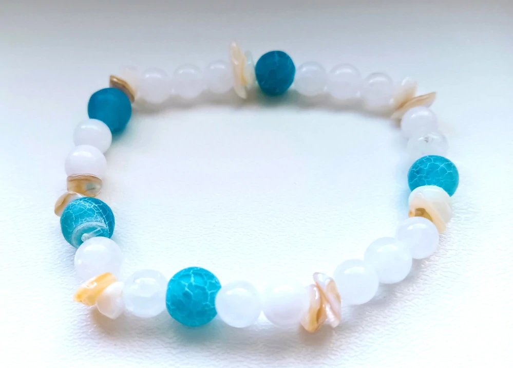 Náramek z modrého Achátu, Jadeitu a pravých mušlí.
