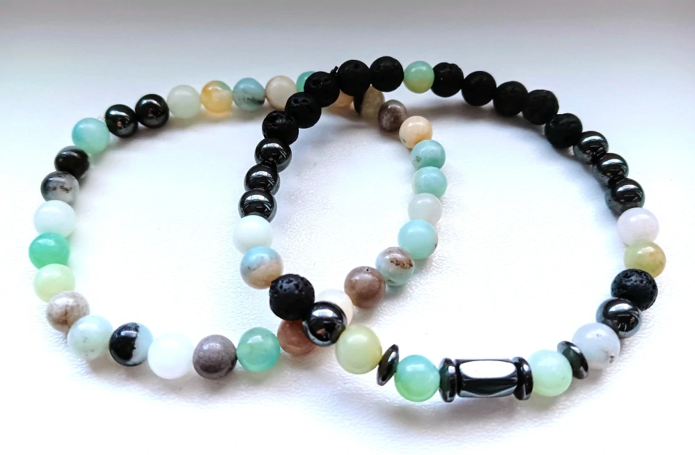 V sadě dva pánské náramky. Z lávy, Amazonitu a Hematitu.