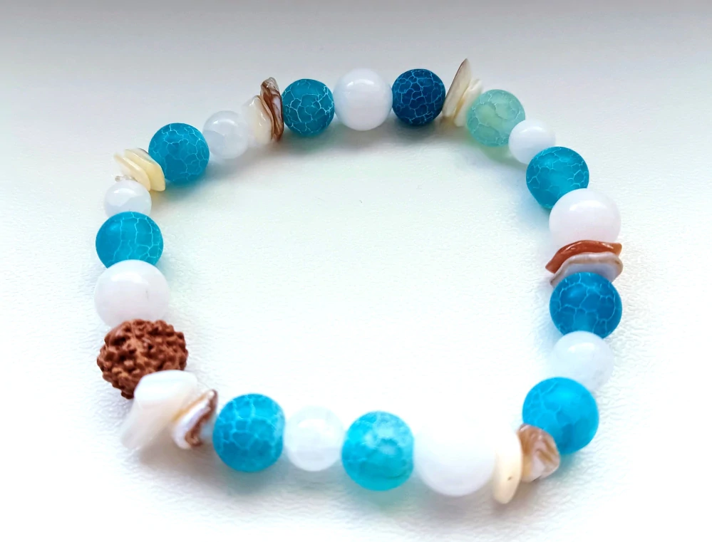 Náramek z mořské kolekce. Achát, Mušle, Jadeit, Rudraksha.