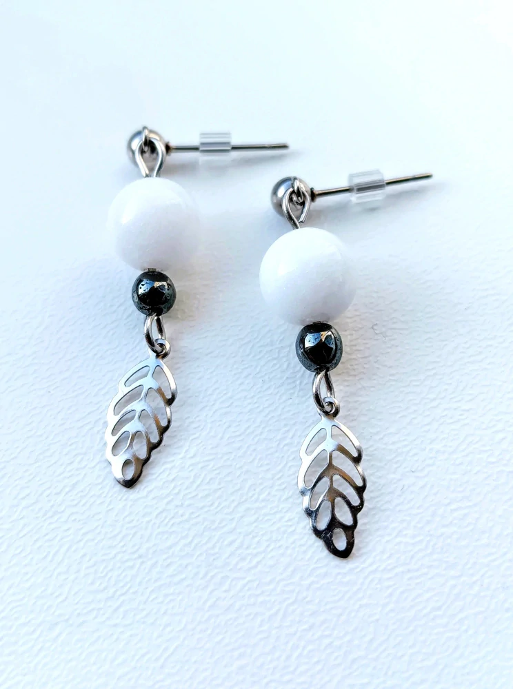 Náušnice z bílého Jadeitu, Hematitu a nerezové oceli.