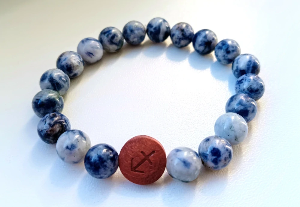 Velké korálky z přírodního minerálního kamene s dřevěným gravírovaným korálkem - znamení zvěrokruhu.