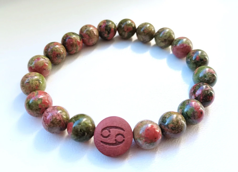 Velké korálky z přírodního minerálního kamene s dřevěným gravírovaným korálkem - znamení zvěrokruhu.